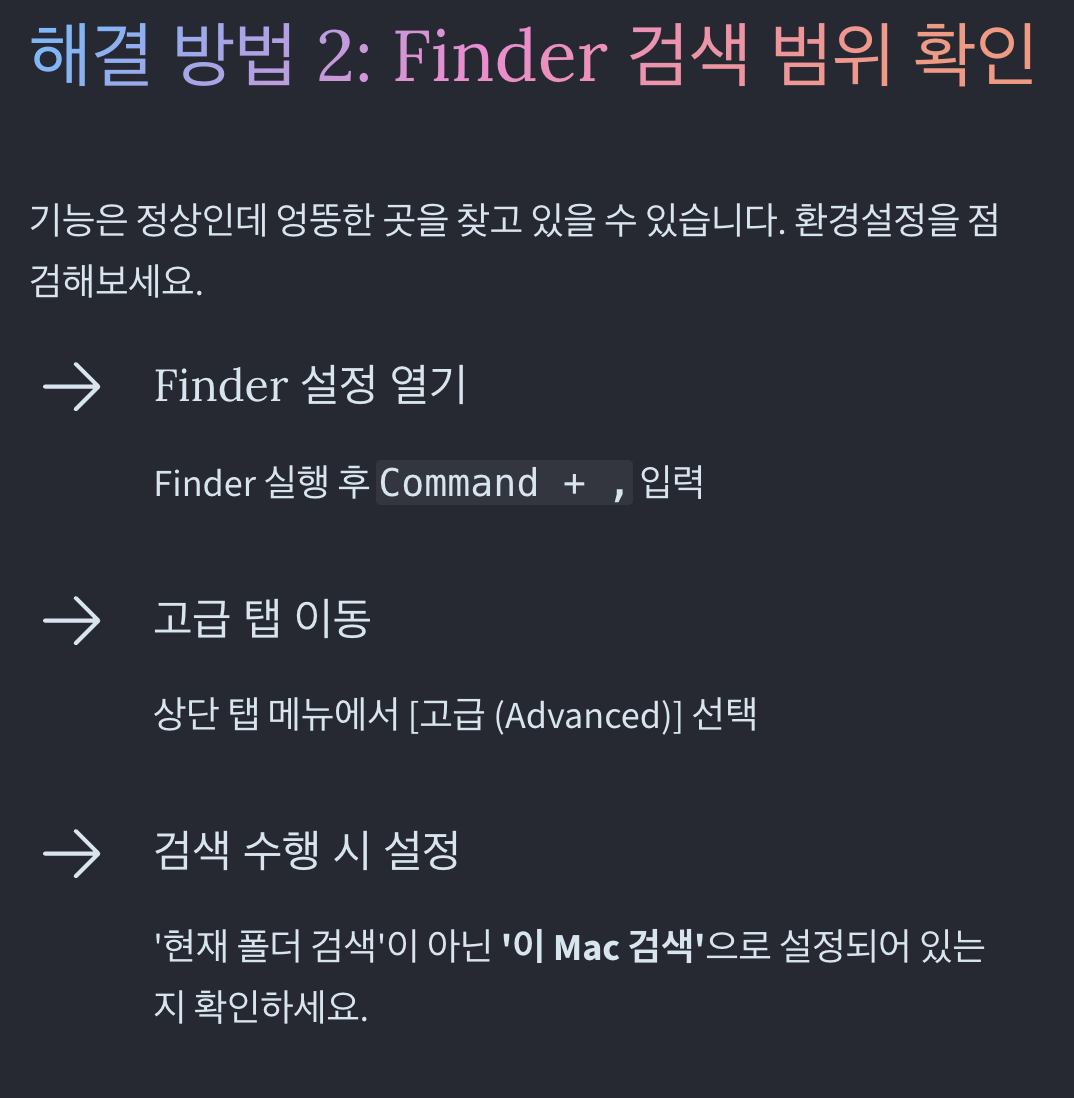 해결 방법 2: Finder 검색 범위 설정 확인
