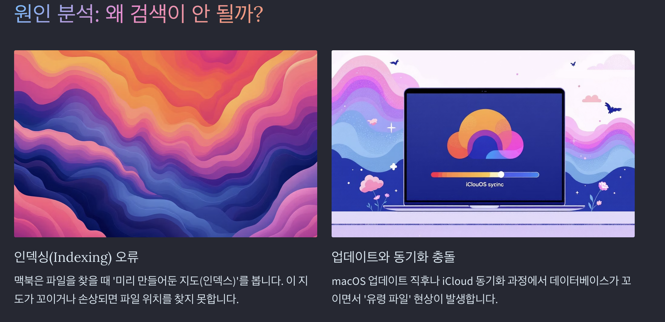 특히 iCloud(아이클라우드)를 사용하여 데스크톱이나 문서를 동기화해서 쓰는 분들에게 이 현상이 더 자주 발생하곤 하는데요. 급하게 파일을 찾아야 하는데 검색이 먹통이면 정말 난감하죠.