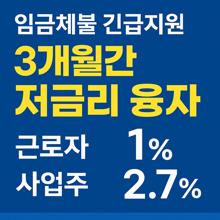 임금체불 근로자 및 사업주를 위한 2025년 저리융자 지원! 3개월간 근로자 1%, 사업주 2.7% 금리로 최대 1.5억 원까지 신청 가능. 근로복지넷에서 온라인 신청하세요.